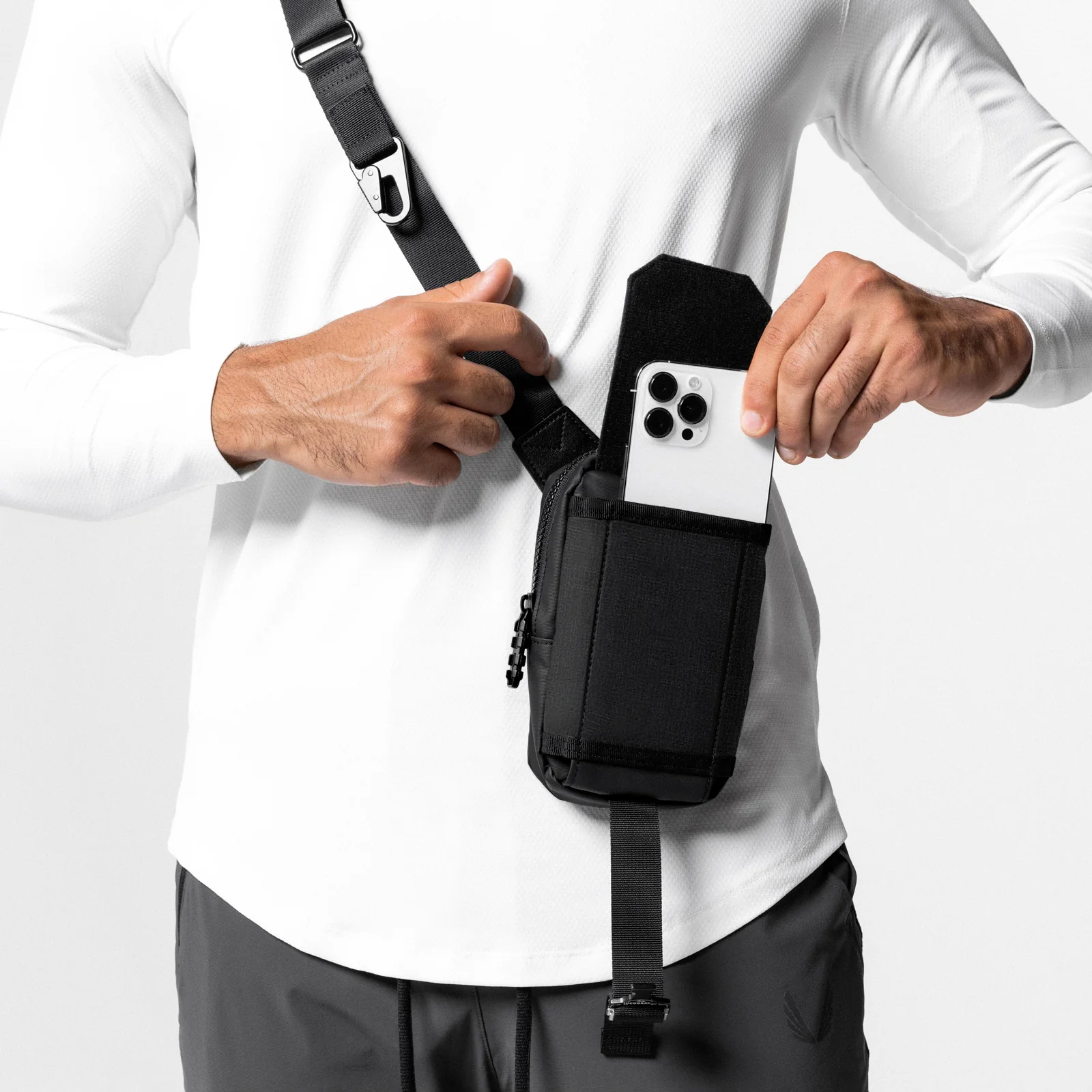 Holster bag for daily essentials fits a phone, wallet, and passport. Constructed from a durable Cordura® material. Main compartment includes an internal elastic stay down strap for bounce-free storage. External flap pocket features Cobra® buckle closure. Complete with custom grenade zipper pull.