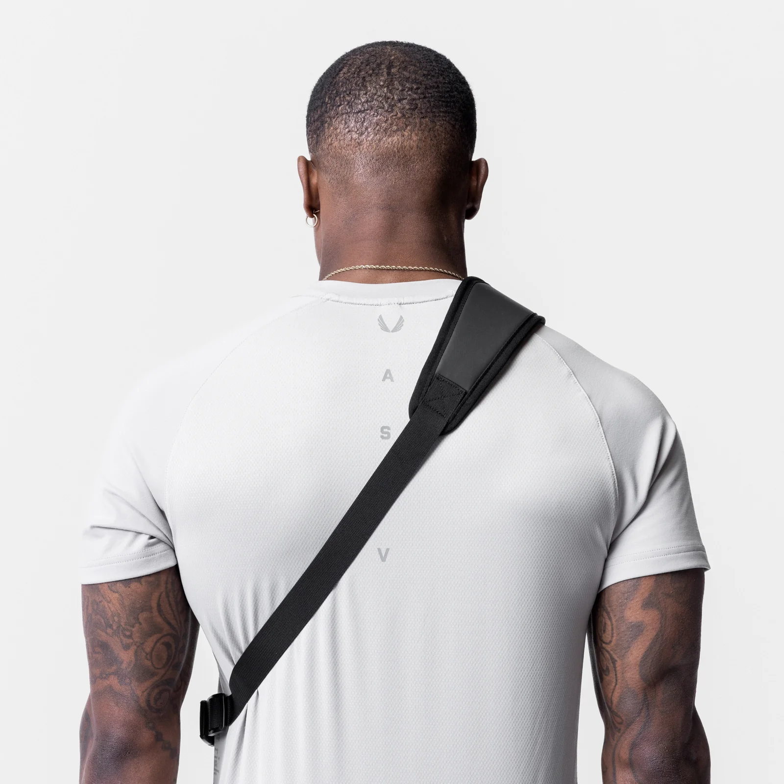Durable holster-style sling bag for daily essentials. Waterproof fabrication provides adaptive weather protection. Main compartment fits a phone, wallet, and passport. Small zip compartment on the shoulder strap fits AirPods and small items. Shoulder strap features MOLLE webbing for attachments and a D-Ring carabiner clip for keys. Matte black soft-touch quick-release buckle secures the pack. Finished with custom zipper pulls and matte rubber patch branding.