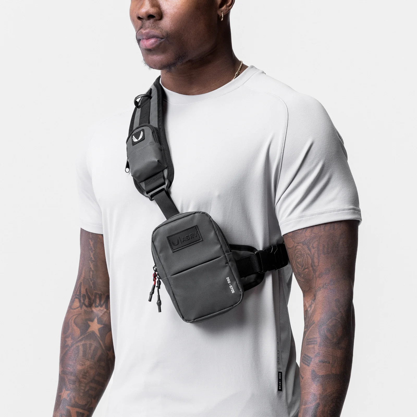 Durable holster-style sling bag for daily essentials. High-vis reflective fabrication provides visibility while commuting at night. Main compartment fits a phone, wallet, and passport. Small zip compartment on the shoulder strap fits AirPods and small items. Shoulder strap features MOLLE webbing for attachments and a D-Ring carabiner clip for keys. Matte black soft-touch quick-release buckle secures the pack. Finished with custom zipper pulls and matte rubber patch branding.