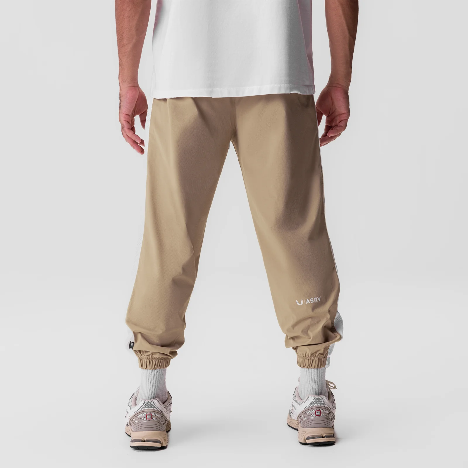 Oversized fit track pants constructed from a mid-weight ripstop with four-way stretch. The material is finished with a DWR treatment for water resistance in light weather conditions. Featuring a right-side zip pocket, a left-side open pocket, and white mesh side panels for ventilation. The waist is secured with 3M™ black reflective drawstrings with heat-wrapped tips. The pants are complete with embroidered branding on the front, and reflective branding on the backside of the right leg.