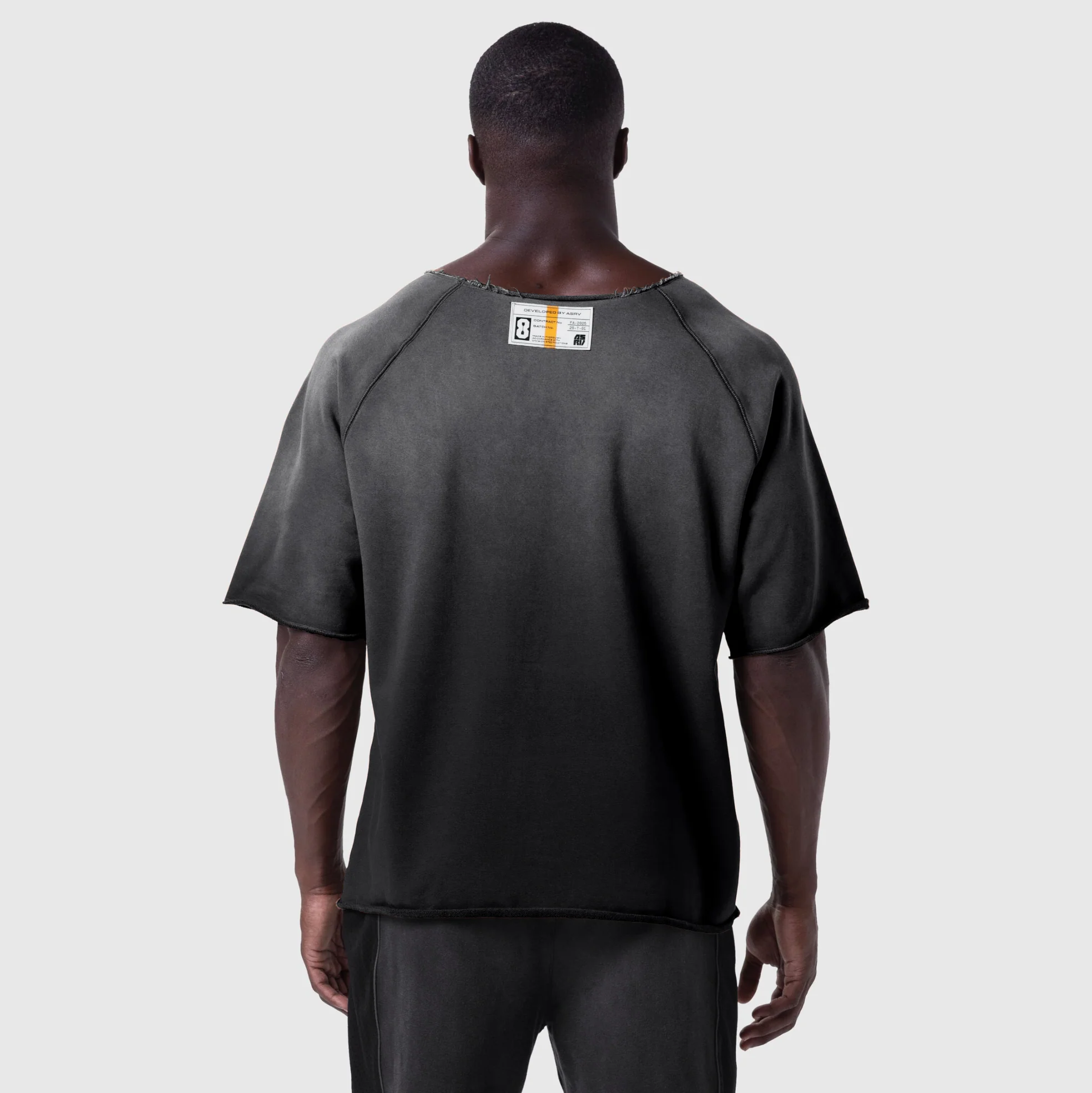Oversized raglan tee designed as a modern pump cover with raw edge finishes and reactive "sun fade" dyeing to convey a naturally worn, vintage aesthetic. Constructed with a wide neck opening, relaxed sleeves, and a draped fit for layering. Completed with our “Training Division” varsity graphic at the chest and a woven patch label at the back neck.