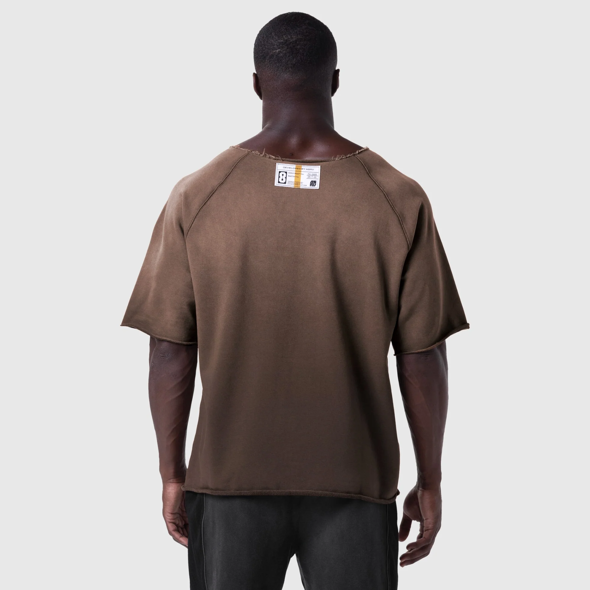 Oversized raglan tee designed as a modern pump cover with raw edge finishes and reactive "sun fade" dyeing to convey a naturally worn, vintage aesthetic. Constructed with a wide neck opening, relaxed sleeves, and a draped fit for layering. Completed with our “Training Division” varsity graphic at the chest and a woven patch label at the back neck.