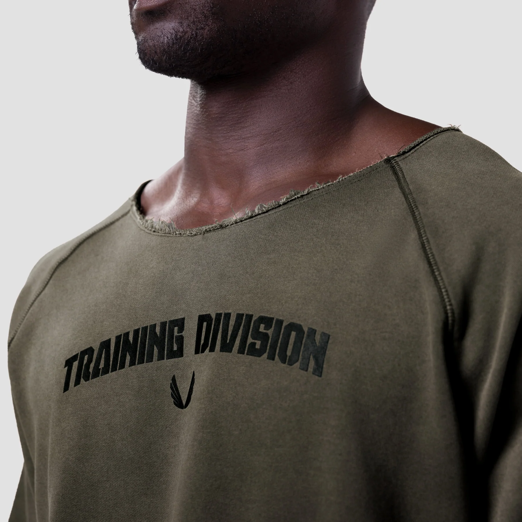 Oversized raglan tee designed as a modern pump cover with raw edge finishes and reactive "sun fade" dyeing to convey a naturally worn, vintage aesthetic. Constructed with a wide neck opening, relaxed sleeves, and a draped fit for layering. Completed with our “Training Division” varsity graphic at the chest and a woven patch label at the back neck.