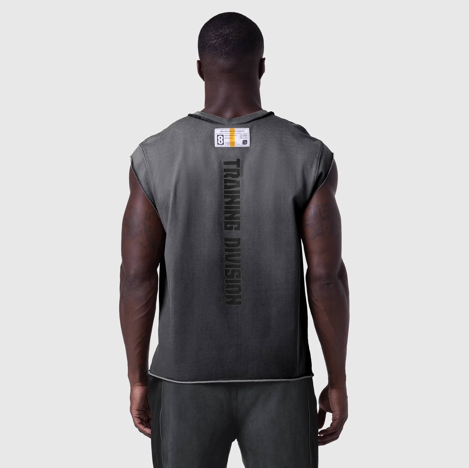 Relaxed-fit cutoff constructed from our Tech Essential™ fabric, an advanced cotton blend with SilverPlus® threads for stretch and anti-odor functionality. Finished with a reactive “sun fade” dye treatment that creates a naturally worn, vintage aesthetic. Designed with cap shoulder sleeves and raw edge openings, subtle distressing at the neckline, a vertical ASRV “Blade” logo on the chest, and a Training Division graphic on the back.